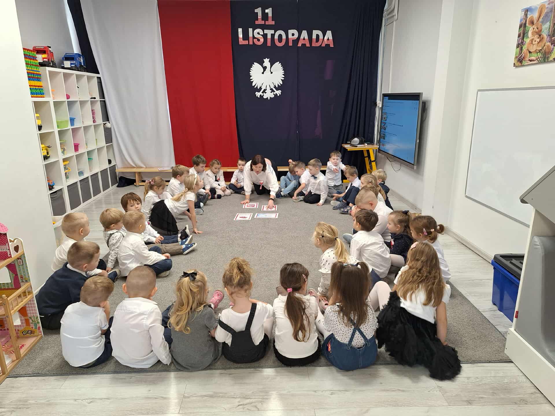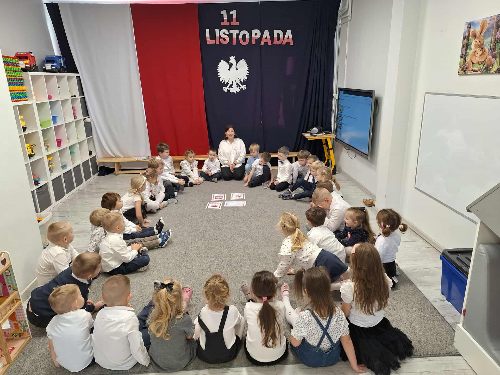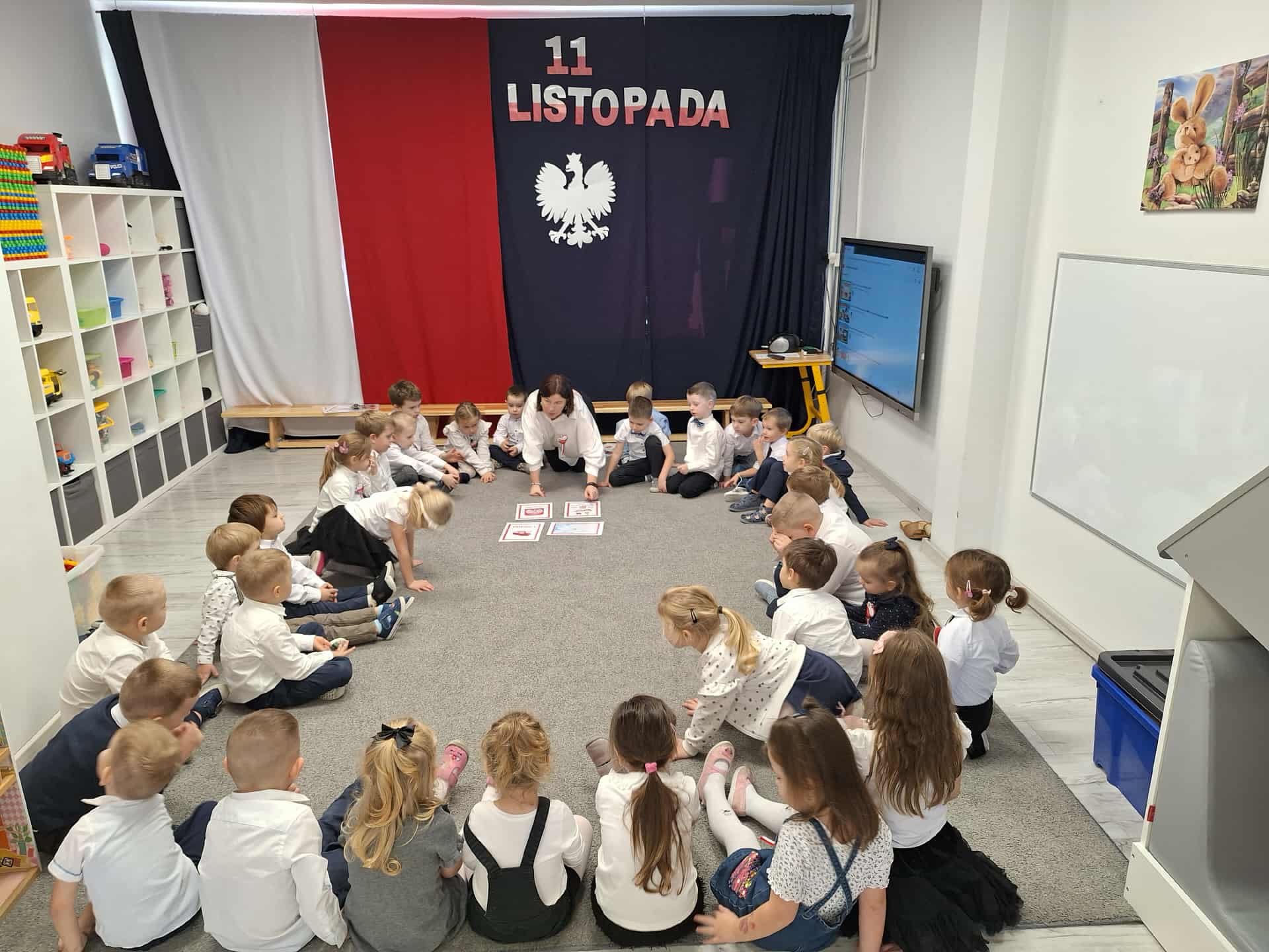 Dnia 7 listopada w naszym przedszkolu obchodziliśmy 11 Listopada czyli Narodowe Święto Niepodległości. Dzieci w przystępny i ciekawy sposób poznały historię odzyskania przez Polskę niepodległości. Obejrzały film edukacyjny poświęcony temu ważnemu wydarzeniu, dzięki któremu mogły lepiej zrozumieć, dlaczego ten dzień jest tak istotny dla wszystkich Polaków. Podczas zajęć przedszkolaki wykonały własnoręcznie biało-czerwone flagi, a dokładnie o godzinie 11:11 wspólnie odśpiewaliśmy „Mazurek Dąbrowskiego” w ramach ogólnopolskiej akcji „Szkoła do Hymnu”. Na zakończenie dnia dzieci miały okazję skosztować tradycyjnych rogali świętomarcińskich, które były pysznym zwieńczeniem naszych patriotycznych obchodów.