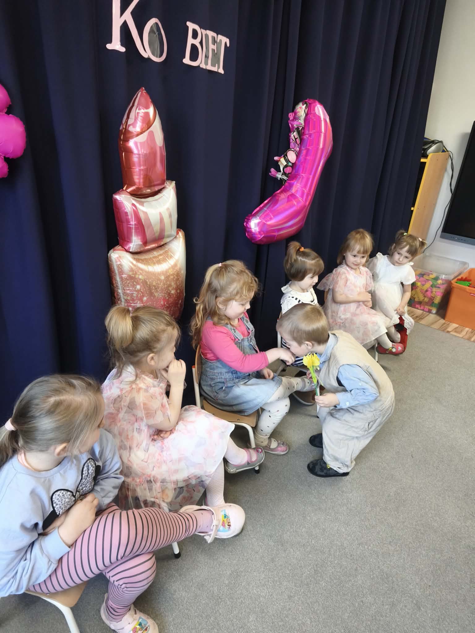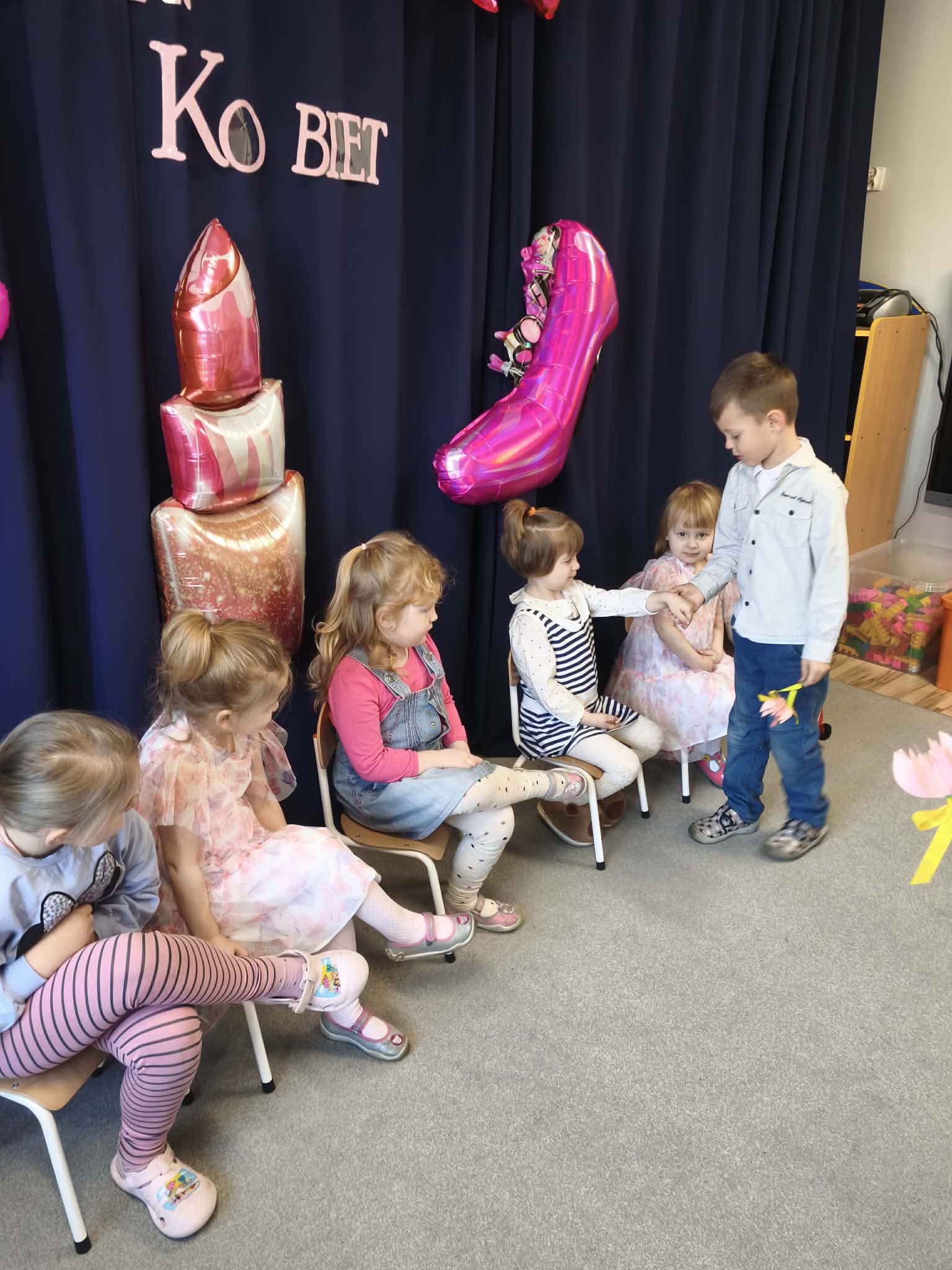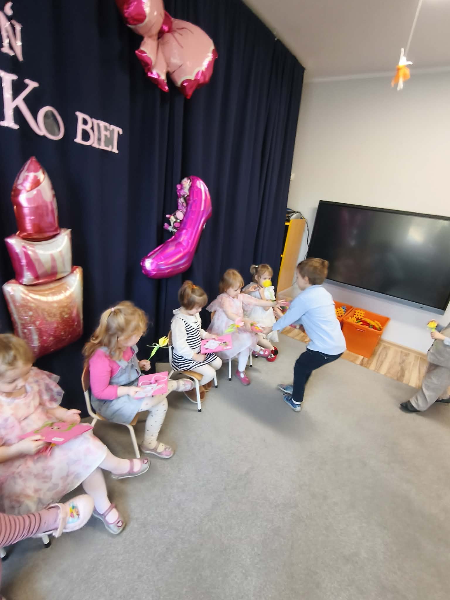 Chłopcy złożyli życzenia, tradycyjnie zaśpiewali swoim koleżankom uroczyste „100 lat”, i wręczyli piękne laurki i niespodzianki. Chłopcy ze szczególnym zaangażowaniem starali się, aby ten dzień uczynić wyjątkowo miłym. Święto Kobiet, które corocznie obchodzimy w naszym przedszkolu, to doskonały sposób do kształtowania u dzieci nawyku obdarowywania upominkami swoich najbliższych. Wszystkie kobietki, te małe i duże dziękują chłopcom za piękne życzenia.