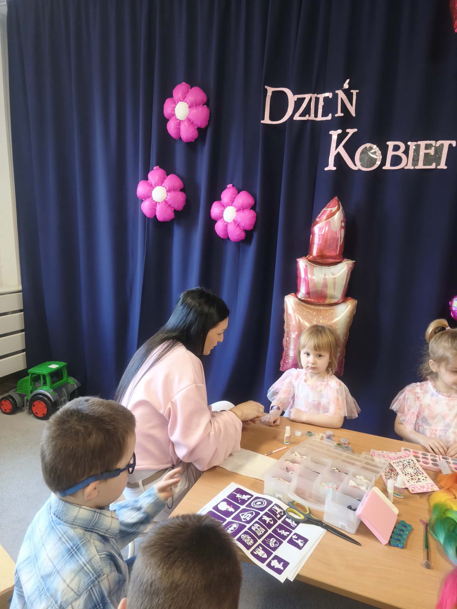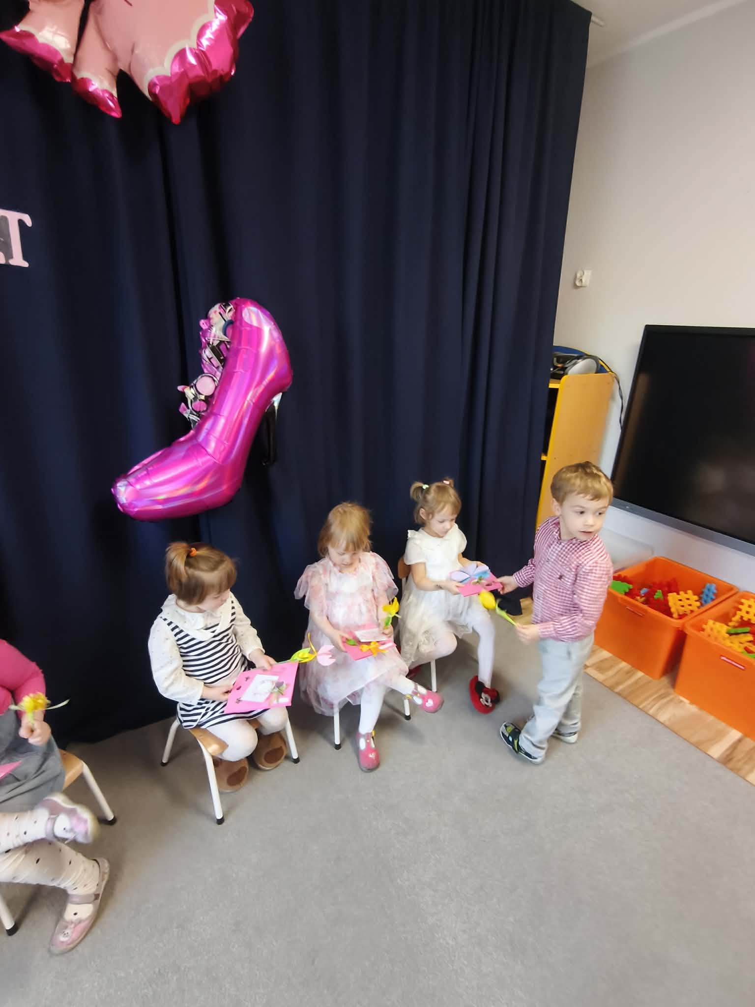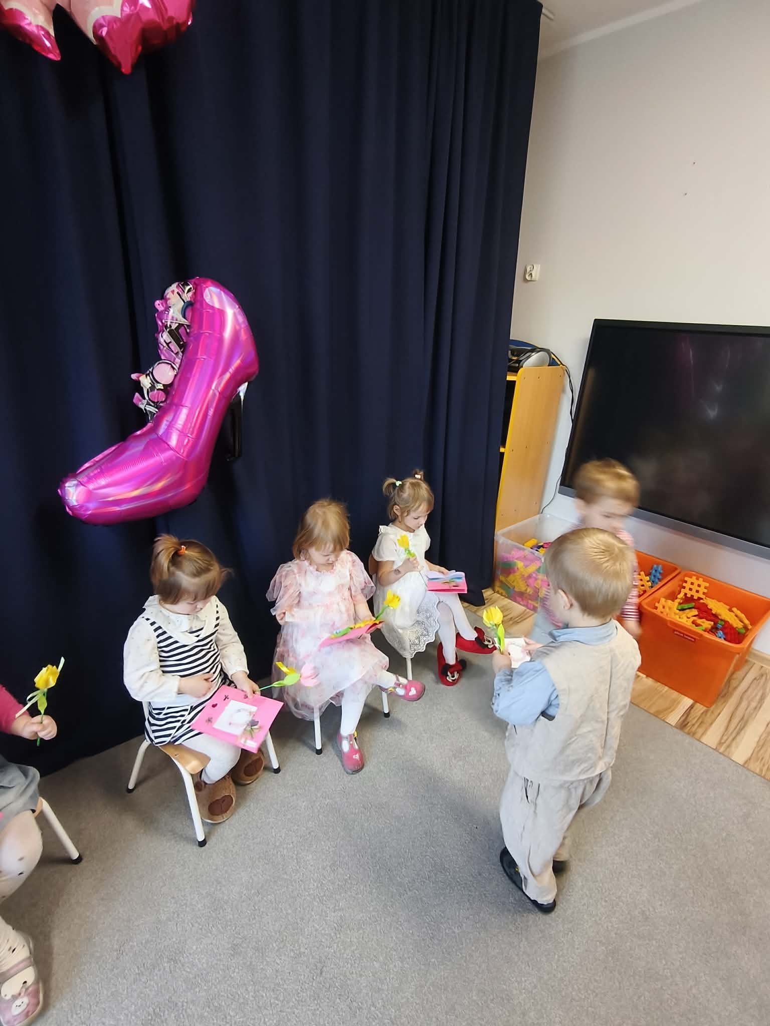 Chłopcy złożyli życzenia, tradycyjnie zaśpiewali swoim koleżankom uroczyste „100 lat”, i wręczyli piękne laurki i niespodzianki. Chłopcy ze szczególnym zaangażowaniem starali się, aby ten dzień uczynić wyjątkowo miłym. Święto Kobiet, które corocznie obchodzimy w naszym przedszkolu, to doskonały sposób do kształtowania u dzieci nawyku obdarowywania upominkami swoich najbliższych. Wszystkie kobietki, te małe i duże dziękują chłopcom za piękne życzenia.