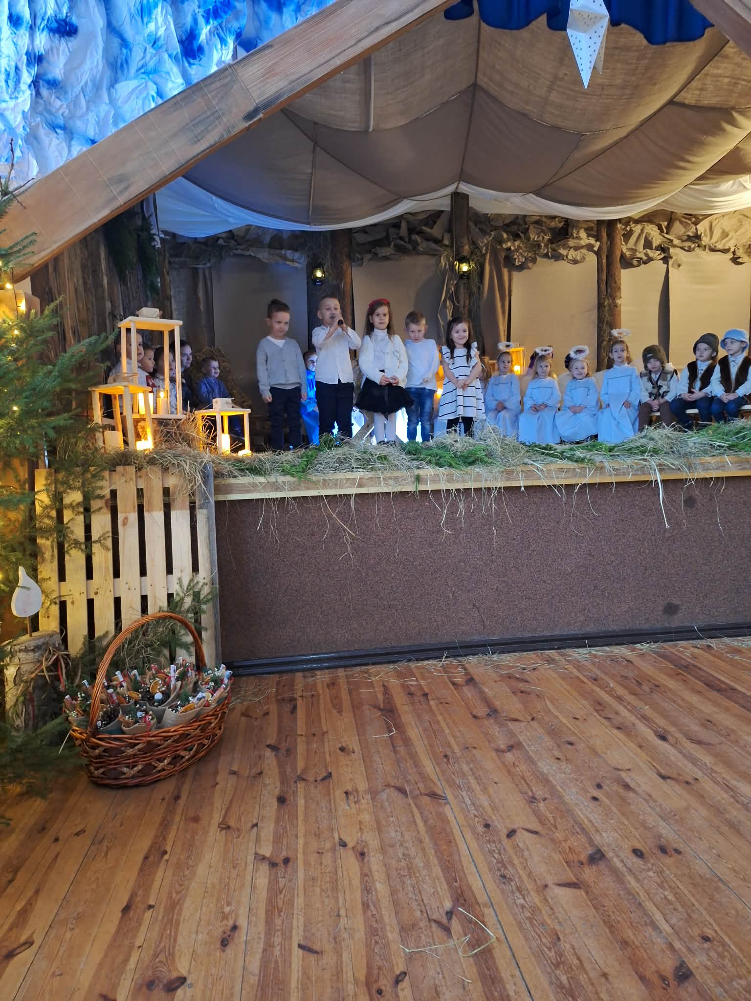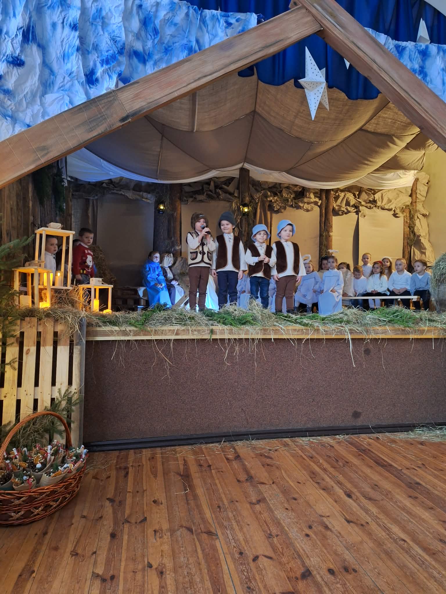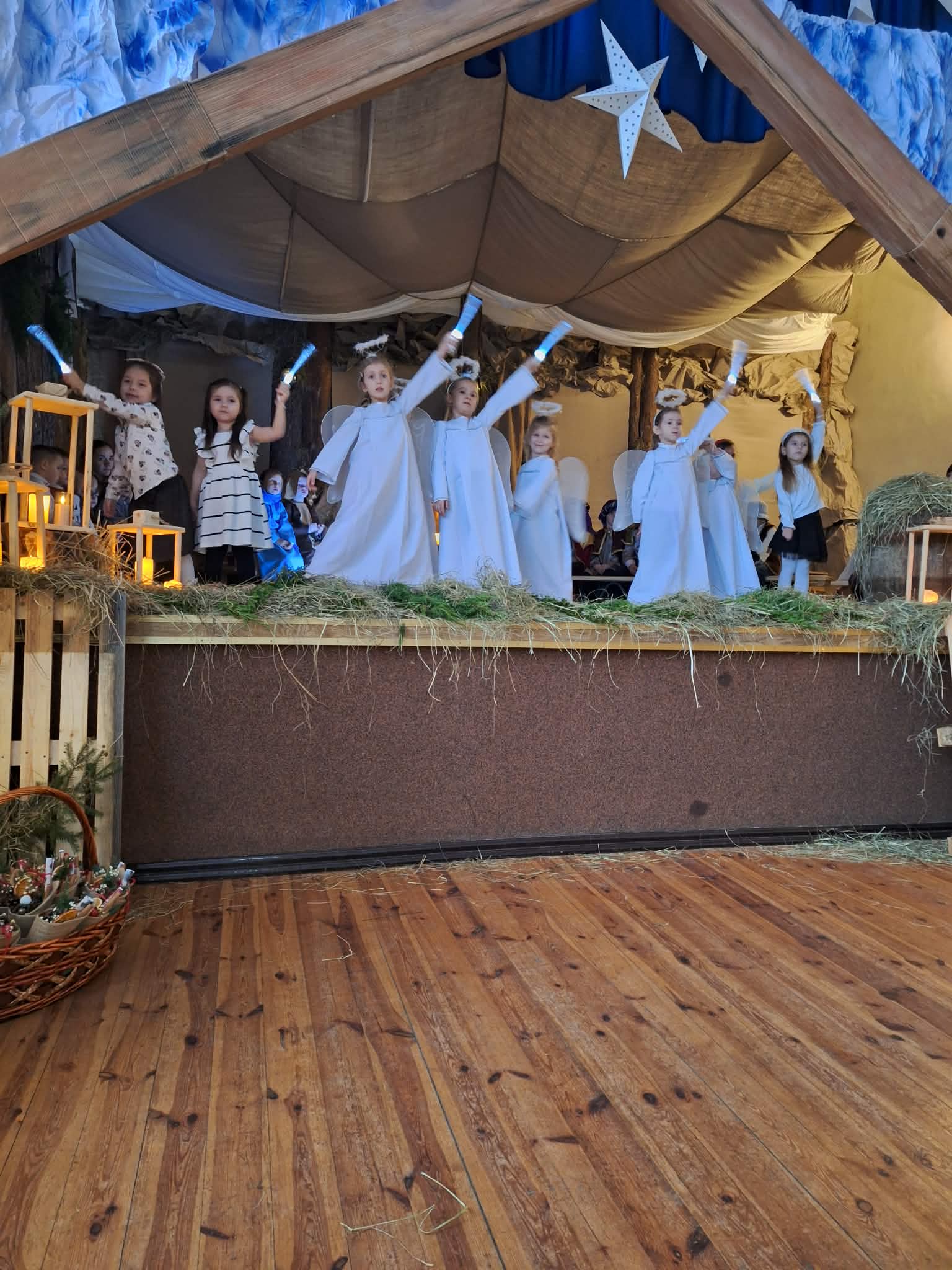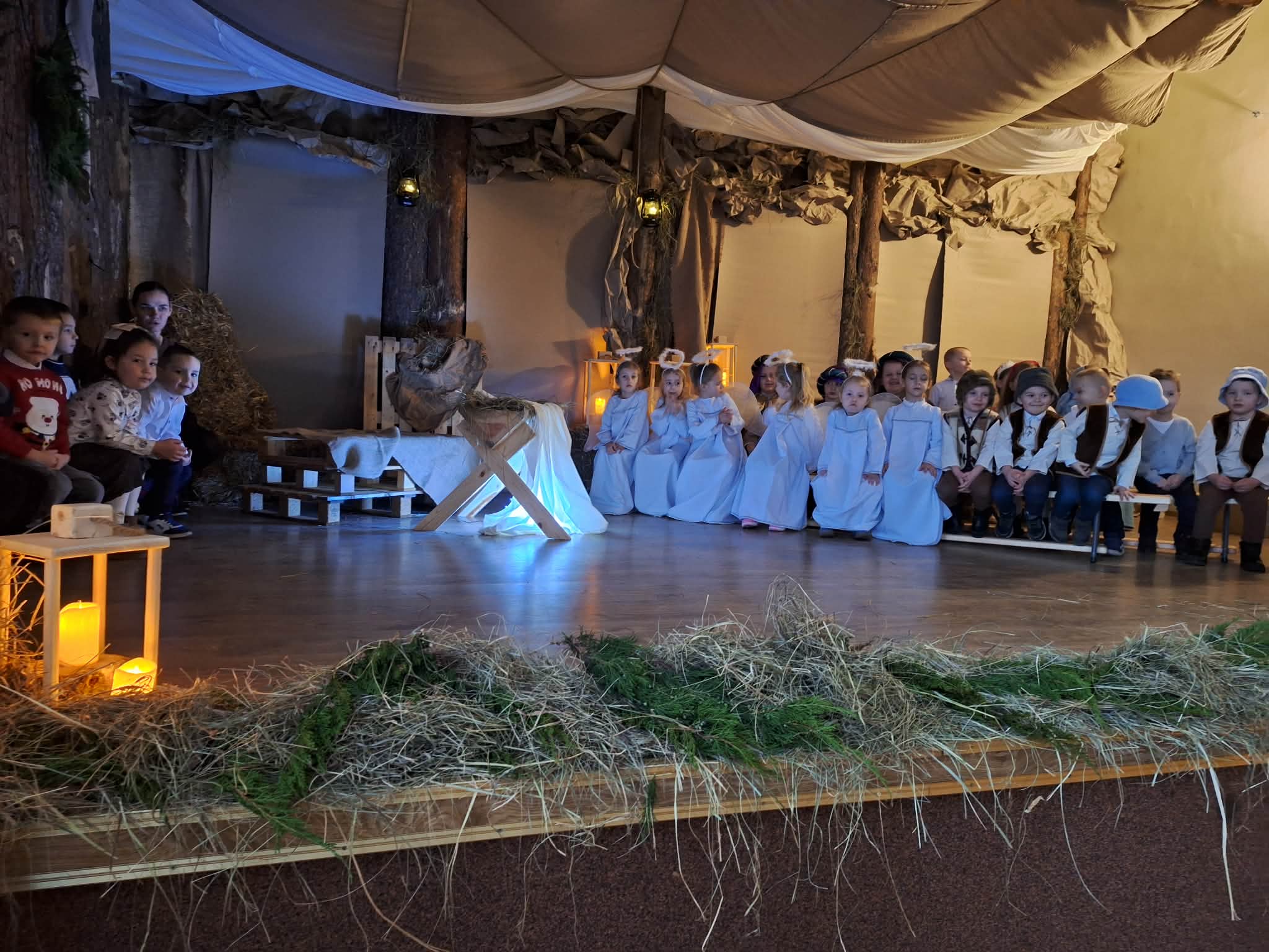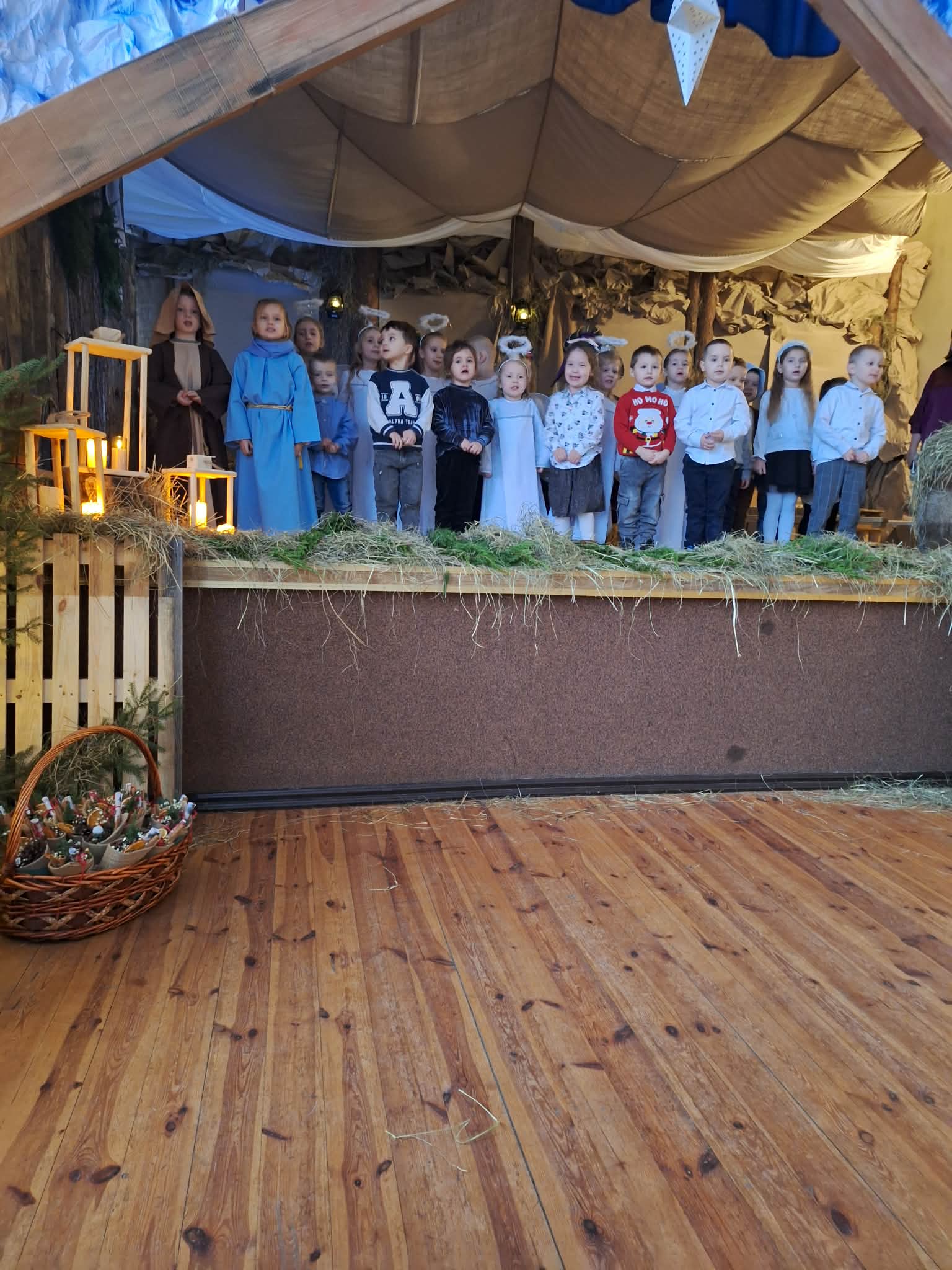 Dnia 17.12.2025r. odbyły się wyjątkowe Jasełka, podczas których dzieci z ogromnym zaangażowaniem zaprezentowały świąteczne przedstawienie. Mali artyści wprowadzili nas w bożonarodzeniowy nastrój poprzez piękne wiersze, kolędy i stroje. Po występie na dzieci czekał słodki poczęstunek, który sprawił im wiele radości. Niezwykłą atrakcją były również odwiedziny Gwiazdora, który obdarował dzieci prezentami i wywołał wiele uśmiechów. Dziękujemy za obecność i wspólne przeżywanie tych magicznych chwil.