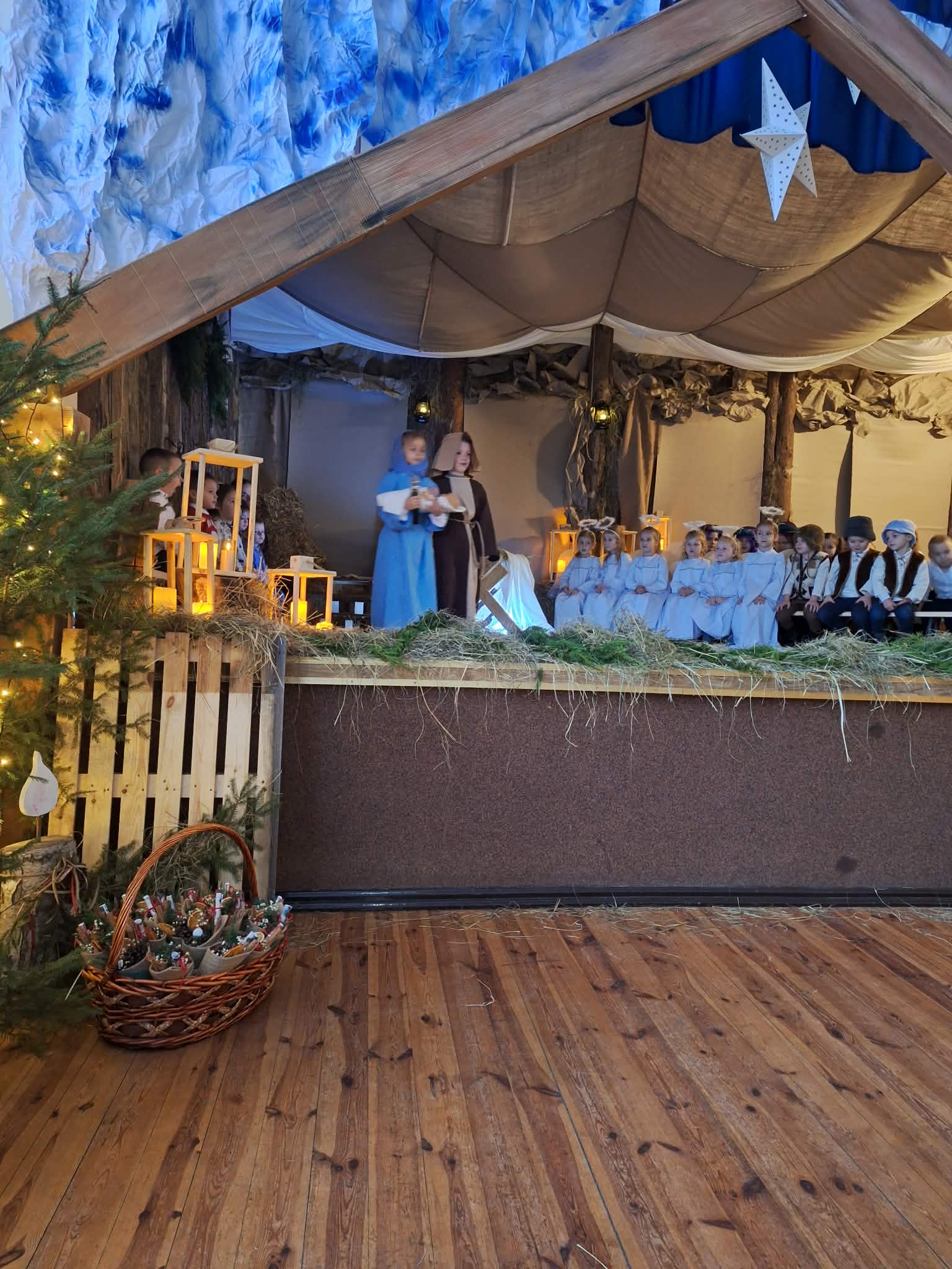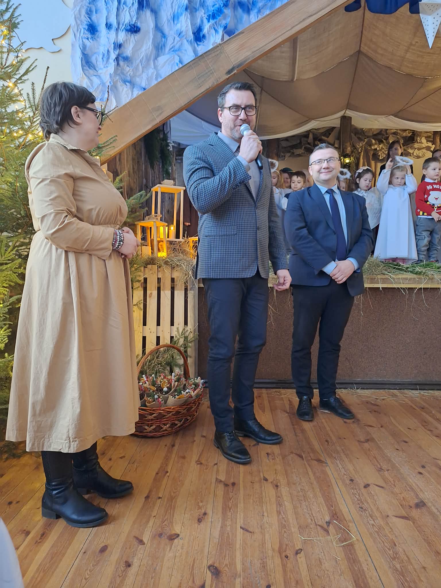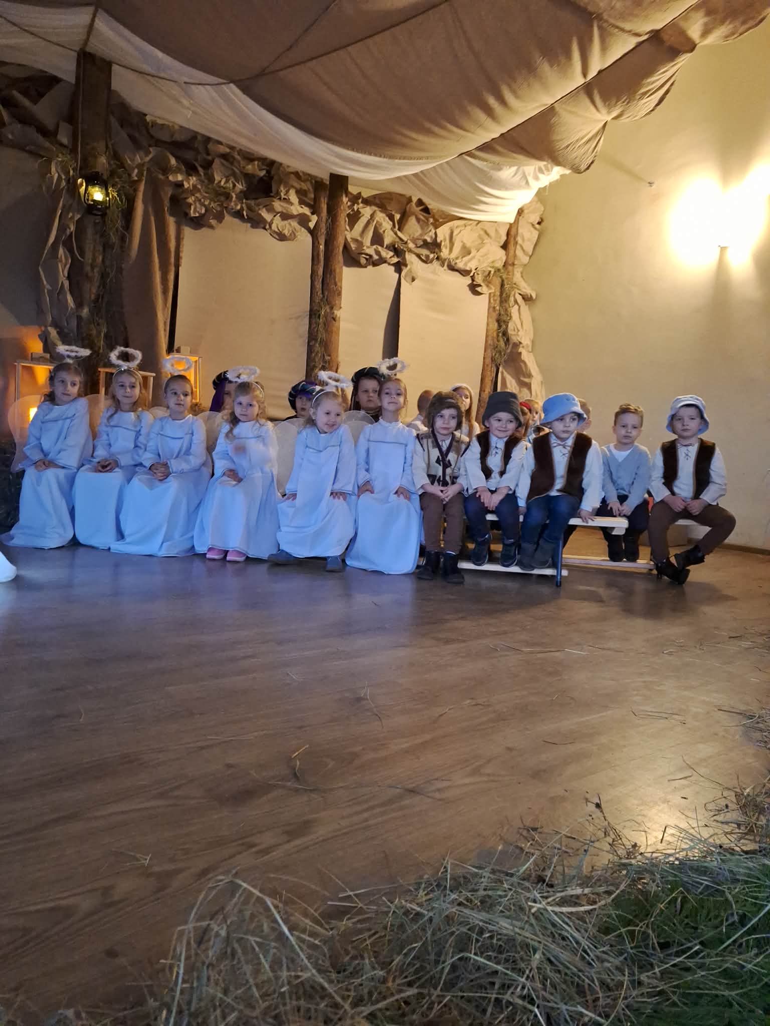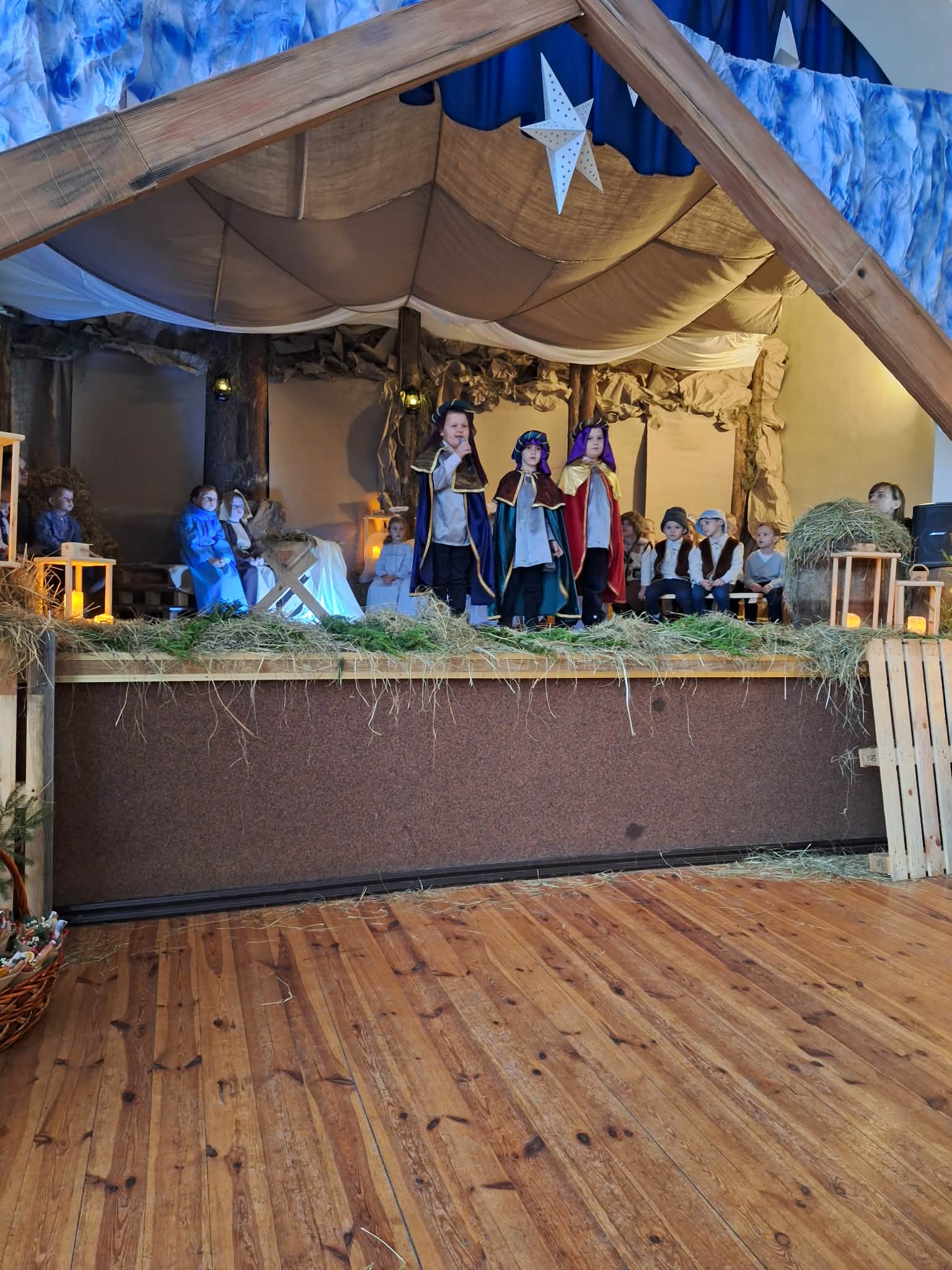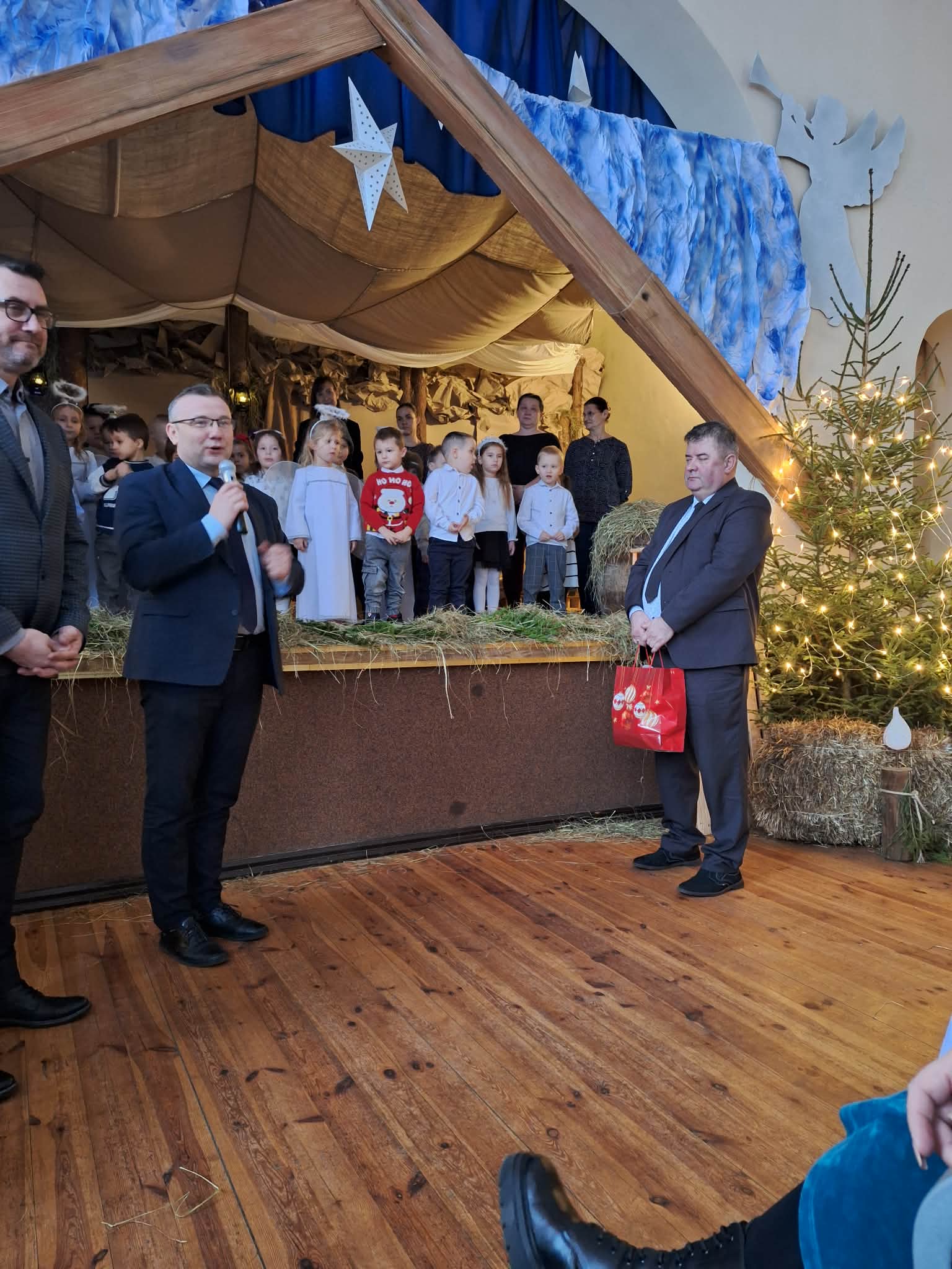 Dnia 17.12.2025r. odbyły się wyjątkowe Jasełka, podczas których dzieci z ogromnym zaangażowaniem zaprezentowały świąteczne przedstawienie. Mali artyści wprowadzili nas w bożonarodzeniowy nastrój poprzez piękne wiersze, kolędy i stroje. Po występie na dzieci czekał słodki poczęstunek, który sprawił im wiele radości. Niezwykłą atrakcją były również odwiedziny Gwiazdora, który obdarował dzieci prezentami i wywołał wiele uśmiechów. Dziękujemy za obecność i wspólne przeżywanie tych magicznych chwil.