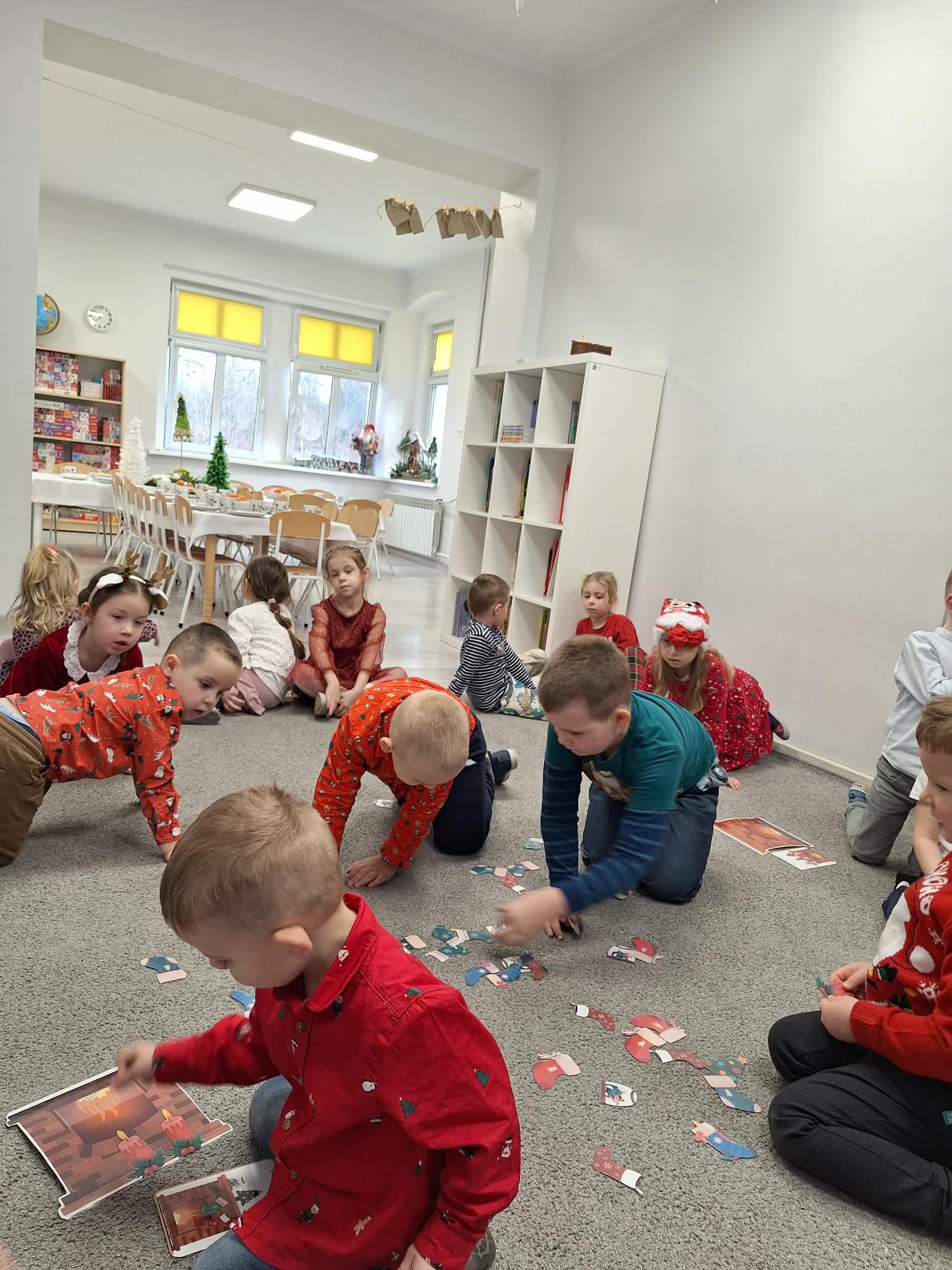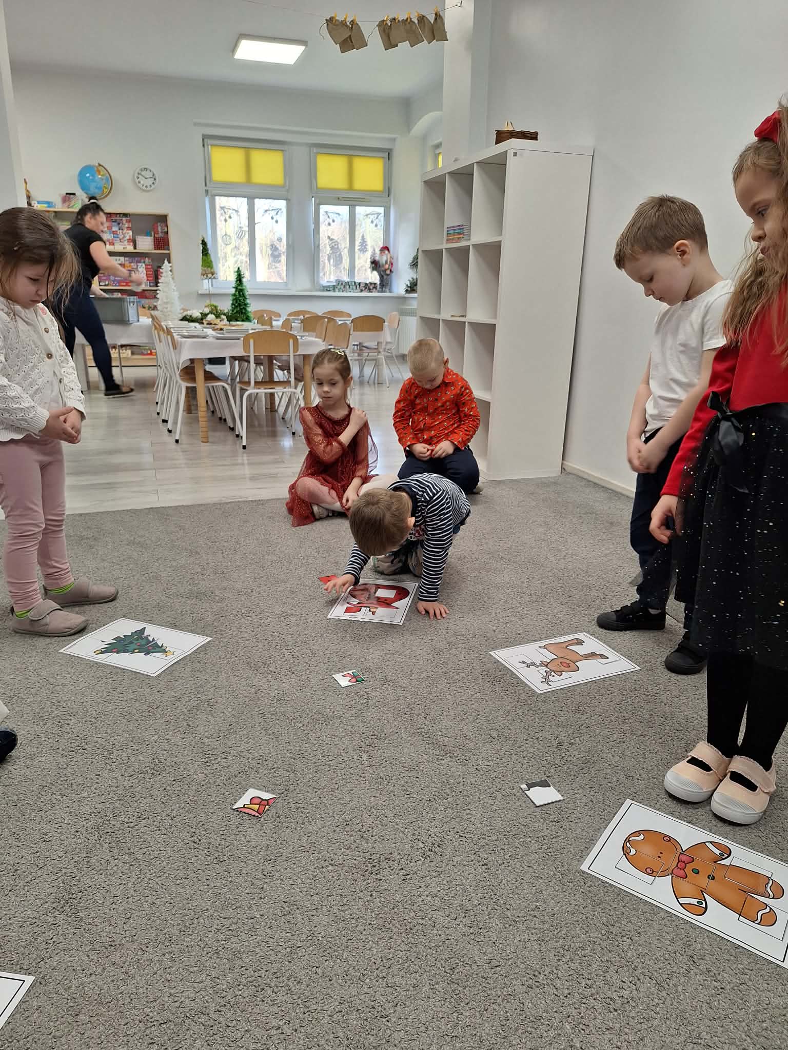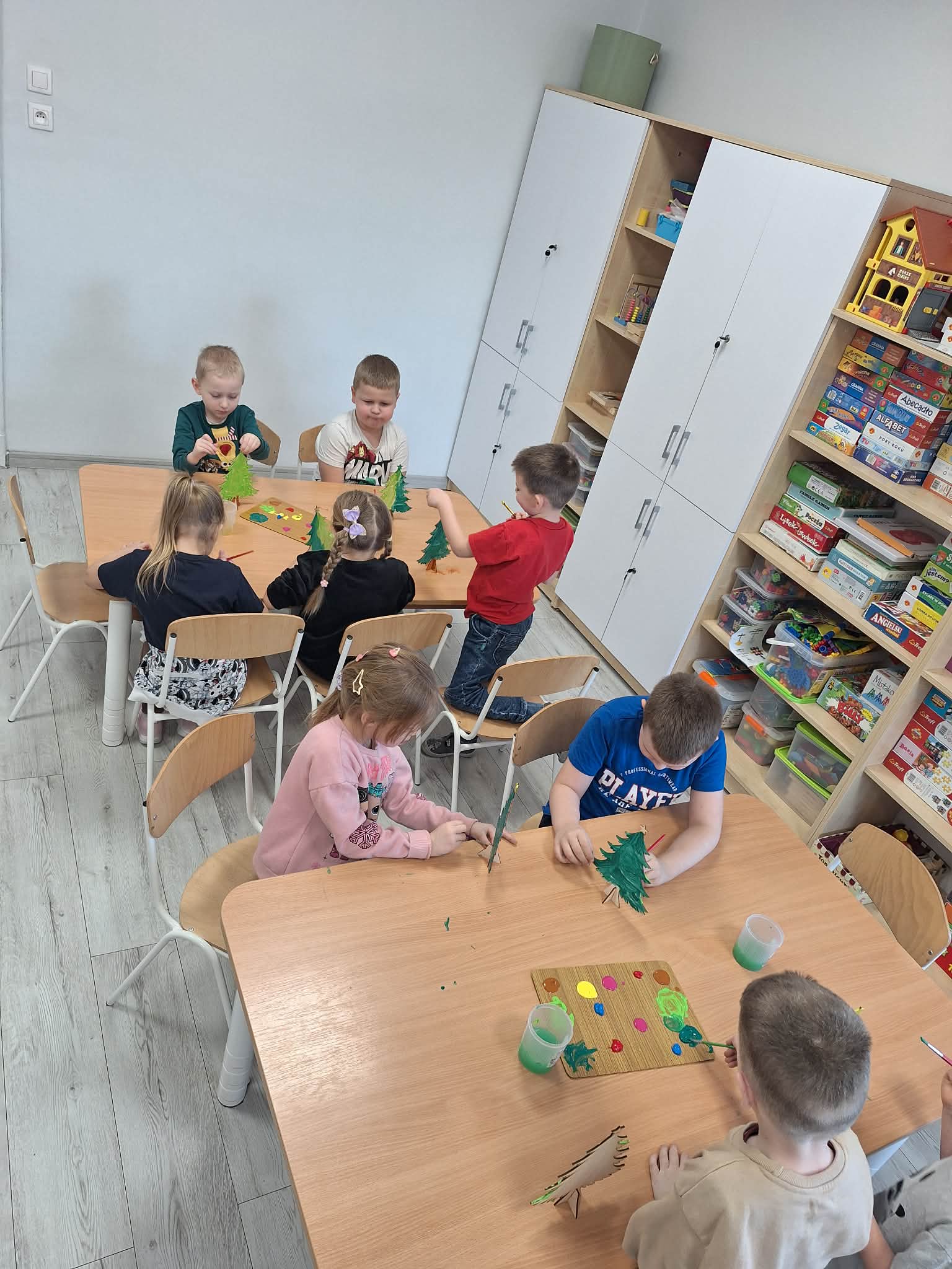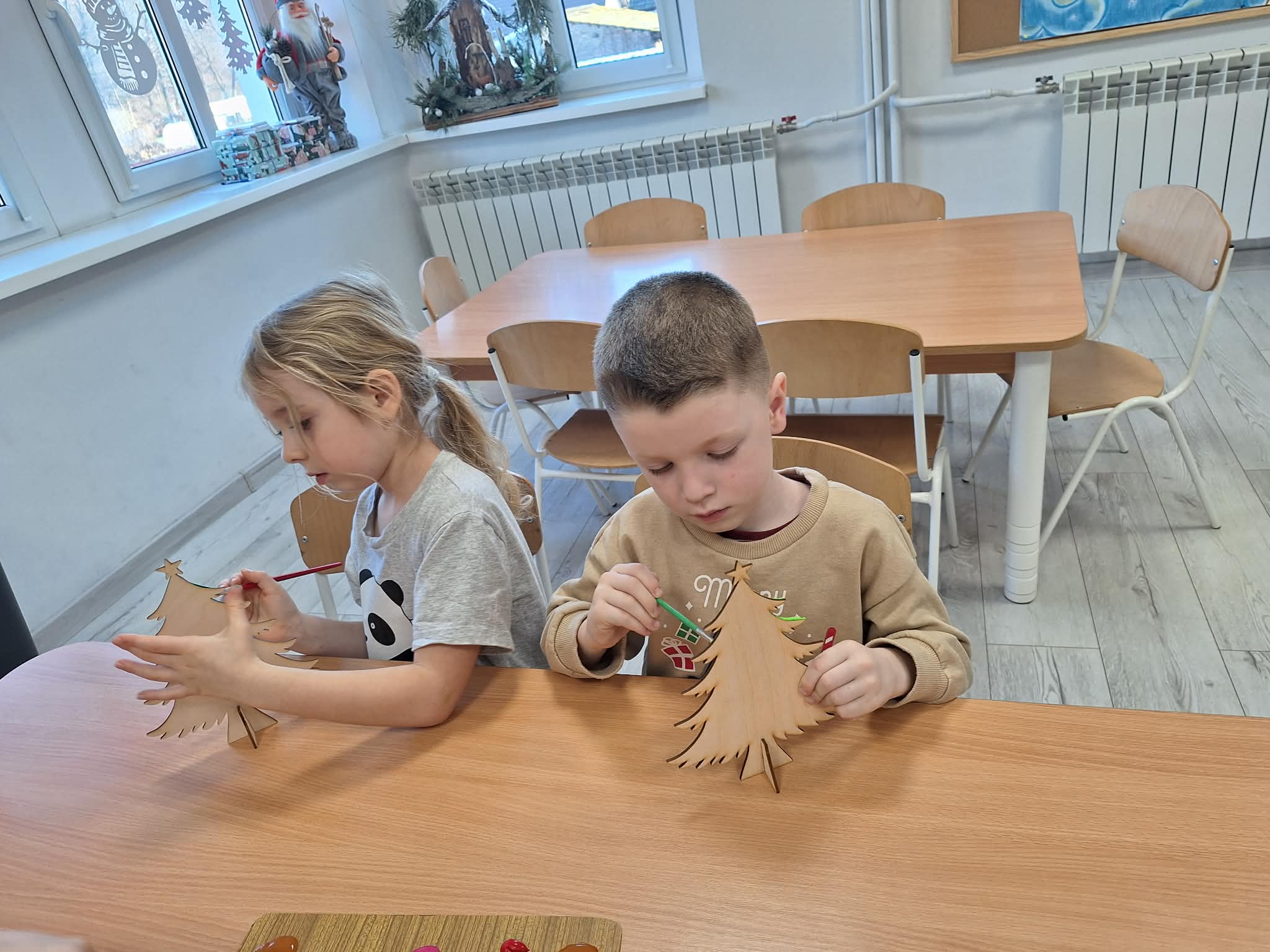Świąteczny czas w przedszkolu to okres pełen radości i twórczej zabawy. Podczas zajęć świątecznych dzieci malują choinki, wykonują prace plastyczne oraz uczą się ubierać choinkę według podanego wzoru, ćwicząc przy tym spostrzegawczość i koncentrację. Wspólne aktywności sprzyjają rozwijaniu wyobraźni, zdolności manualnych oraz wprowadzają dzieci w magiczną atmosferę świąt.
