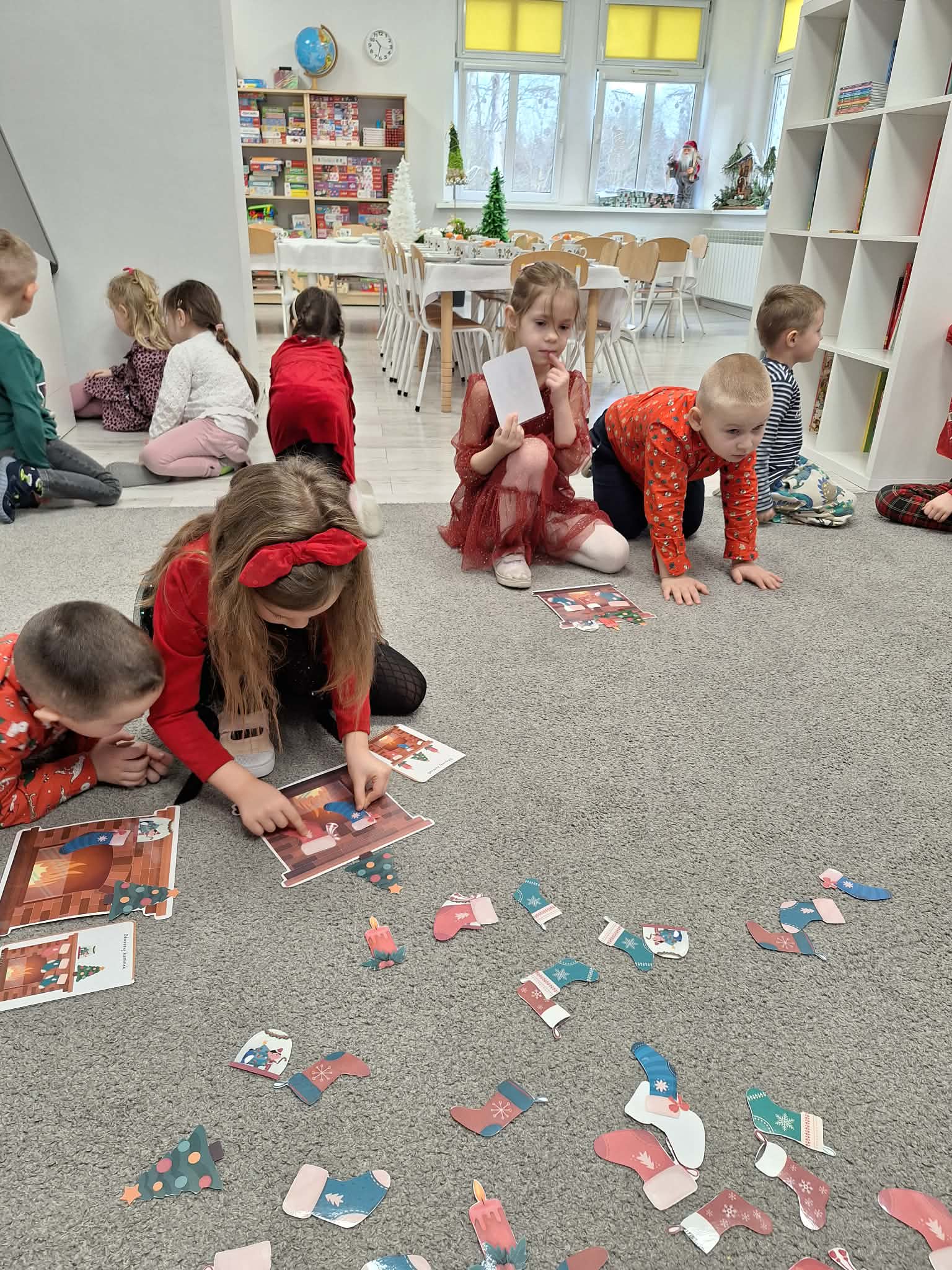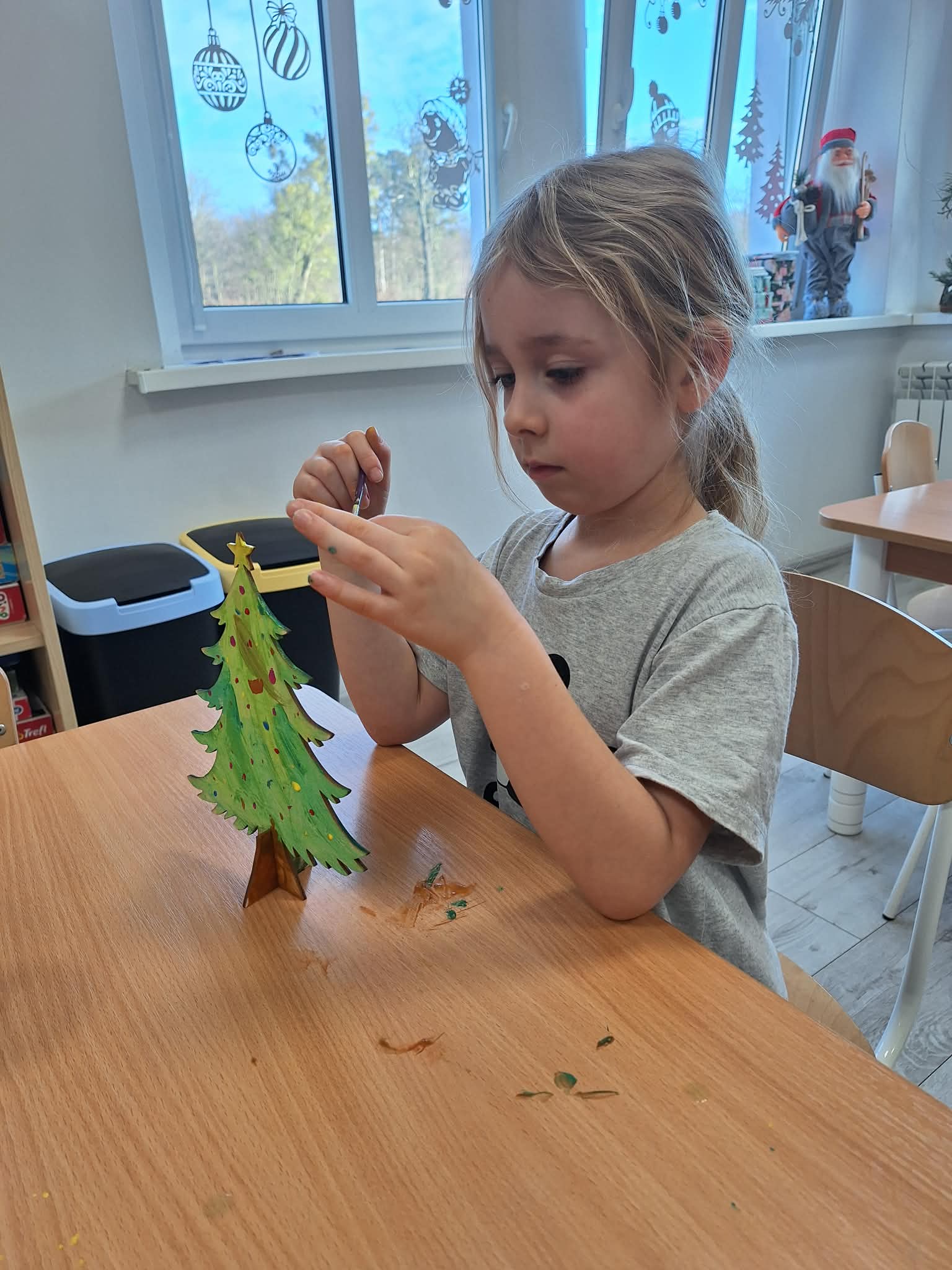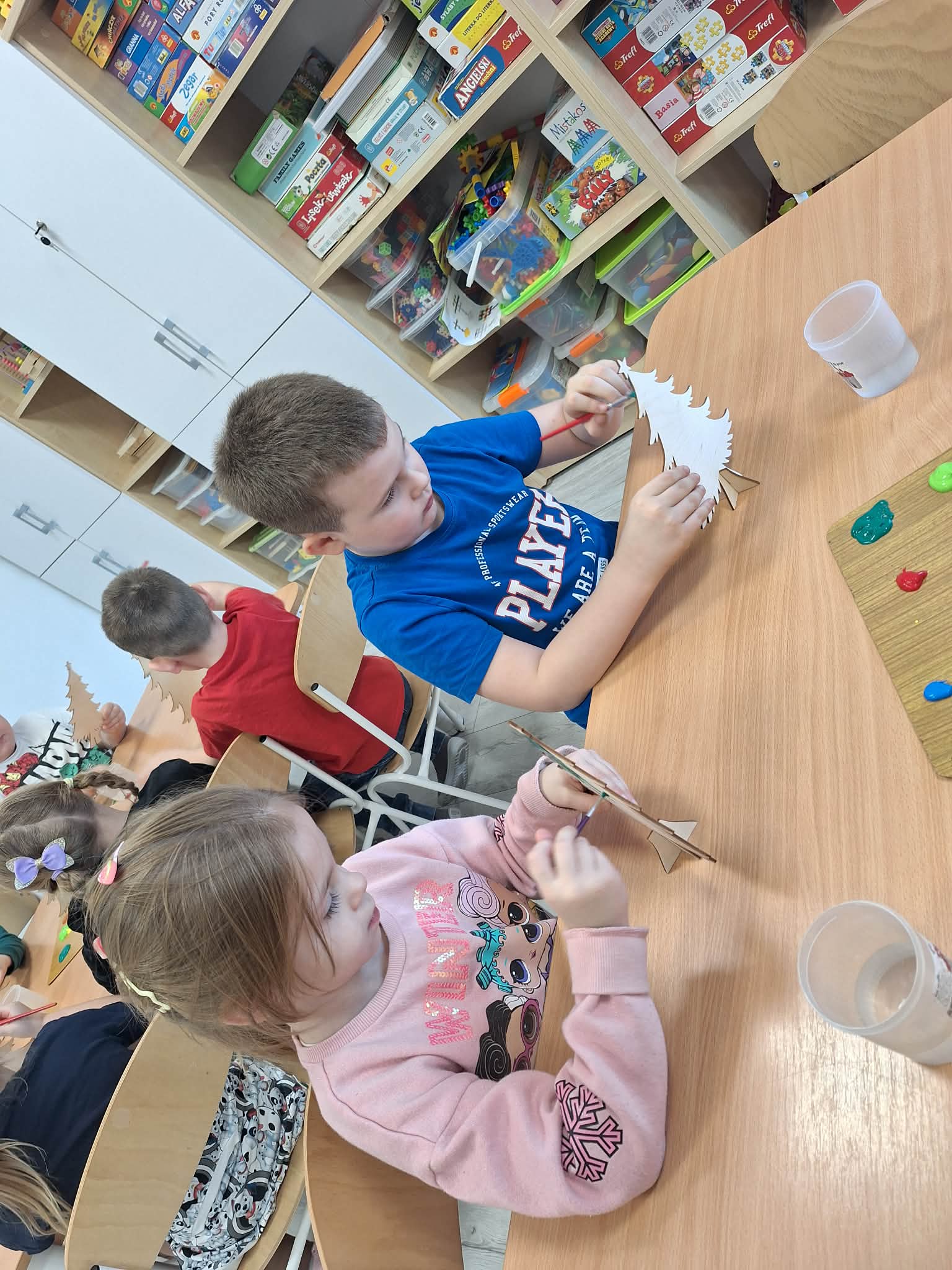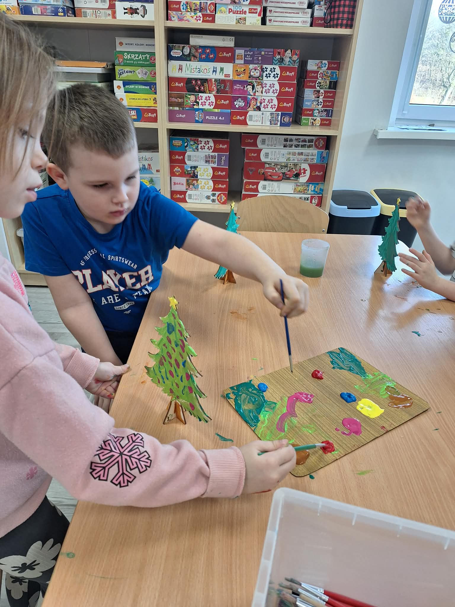 Świąteczny czas w przedszkolu to okres pełen radości i twórczej zabawy. Podczas zajęć świątecznych dzieci malują choinki, wykonują prace plastyczne oraz uczą się ubierać choinkę według podanego wzoru, ćwicząc przy tym spostrzegawczość i koncentrację. Wspólne aktywności sprzyjają rozwijaniu wyobraźni, zdolności manualnych oraz wprowadzają dzieci w magiczną atmosferę świąt.